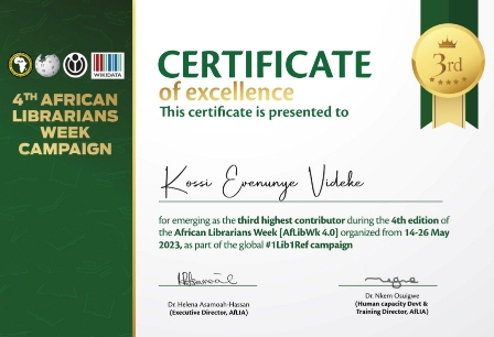 Et le jeune Togolais Kossi Evenunye Videke du pseudo Wikipédia « Videke » a remporté le « Certificat d’Excellence » pour avoir enlevé la 1ère place au Togo et la 3ème place en Afrique, parmi les 30 meilleurs contributeurs sur Wikipédia à cette 4e édition de African Librarians Week grâce à ses contributions panafricanistes.