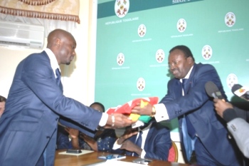 C’est le vice-capitaine des Eperviers Serge Akakpo qui a reçu des mains de M.Ahoomey-Zunu, le drapeau national, Emmanuel Adébayor – le capitaine – étant absent.