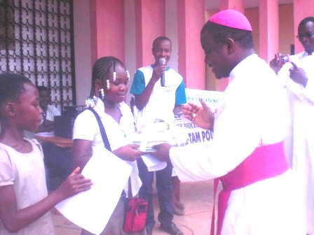 C’est le père Evêque qui a ouvert la cérémonie par une prière de bénédiction à tous les enfants. La sœur Cécile FIANGOR, directrice de la bibliothèque diocésaine a dans son allocution attiré l’attention des enfants sur la notion de la paix.