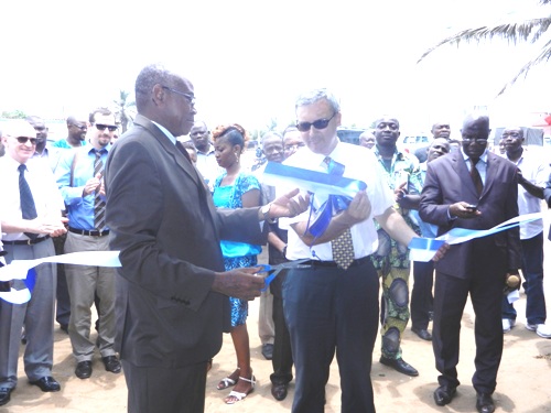 En Photo : Nicolas Warnery (au centre) et le Contre Amiral Fogan Adégnon (à gauche) inaugurant les paillottes