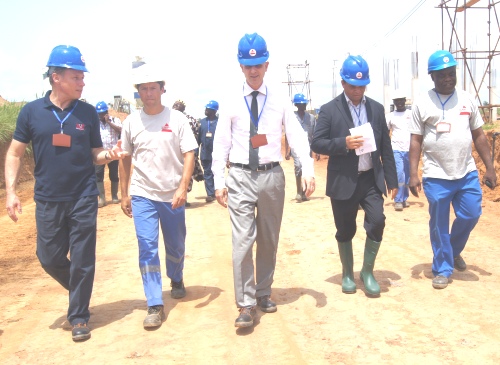 Muni d’un casque avec des chaussures type bottes de sécurité en cuir (de la SCANTOGO Mines), Joseph Weiss a visité plusieurs compartiments du site qui emploie actuellement 330 chinois et 230 locaux. Le Préfet de Yoto et Togbui Akpodo Toklokpa III, ainsi que leurs collaborateurs ont aussi profité de l’occasion pour découvrir cette usine en construction.