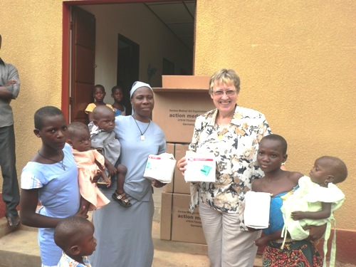 En Photo: Mme Margret Kopp et l’une des soeurs de l’orphelinat Jean Paul II avec des enfants