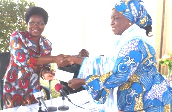 En Photo: Mme Victoire Tomégah-Dogbé remettant de chèque à la responsable d’un des groupements