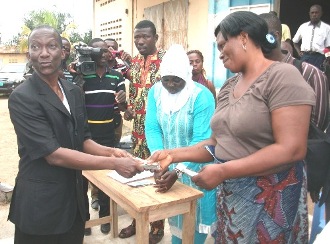 En Photo: Le Colonel Ouro-Koura Agadazi remettant de l’argent à une productrice de riz juste après l’achat du riz à Kpélé Adéta