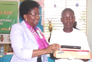 En Photo: Mme Victoire Tomégah Dogbé remettant un kit scolaire et un ordinateur portable à Laurent Yendoubouan Damétougle, 1er de tout le Togo au BEPC avec 19,36 de moyenne