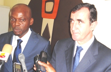 En Photo: MM.Dussey (à gauche) et Berlanga-Martinez devant des journalistes à la fin des discussions