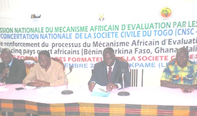 Le Togo pour sa part, a adhéré au MAEP le 28 juin 2008 à Sharm El Cheik, lors du 9e Forum des chefs d’Etats et de gouvernement du MAEP. La mise en œuvre du Mécanisme au niveau national a reçu l’appui technique et financier de la fondation Hanns Seidel qui a financé plusieurs missions d’échanges avec les pays voisins et des ateliers de formation des acteurs gouvernementaux et non-gouvernementaux.