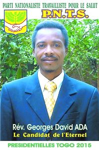 « Le Parti Nationaliste Travailliste pour le Salut (PNTS) déclare la candidature de son Président national Rév. Georges David ADA, aux élections présidentielles de 2015, et invite tous les Togolais et toutes les Togolaises, à soutenir son Candidat pour un TOGO uni, prospère, plus juste et démocratique », affiche cette formation politique sur sa page facebook.