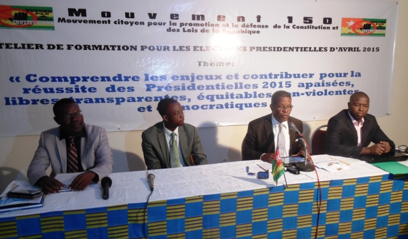 Placée sous le thème : « Comprendre les enjeux et contribuer pour la réussite des présidentielles 2015 apaisées, libres, transparentes, équitables, non violentes et démocratiques », cette formation initiée par le Mouvement 150 (Mouvement Citoyen pour la Promotion et la Défense de la Constitution et des Lois de la République), a pour objectif de sensibiliser les participants sur les voies et moyens à adopter pour que le scrutin présidentiel soit apaisé et sans violence.