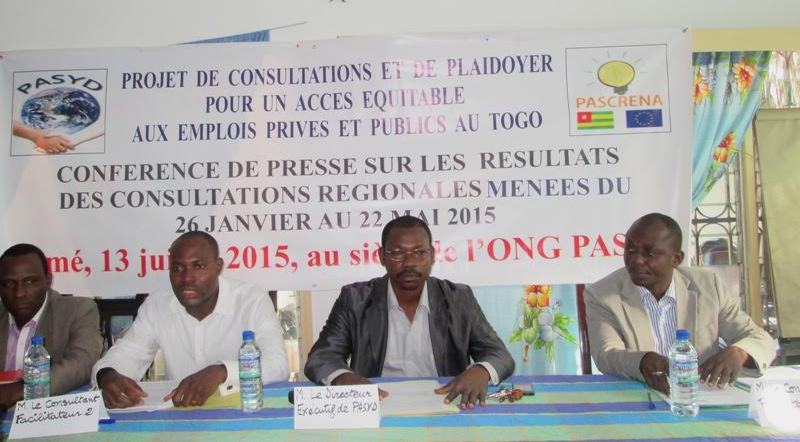 Les résultats des consultations régionales menées par l’ONG Partage et Action en Synergie pour le Développement (PASYD) du 26 janvier au 22 mai 2015 dans le cadre du projet de consultations et de plaidoyer pour un accès équitable et inclusif aux emplois privés et publics au Togo ont été présentés ce lundi à Lomé aux professionnels des médias lors d’une conférence de presse, a constaté une journaliste de l’Agence Savoir News.