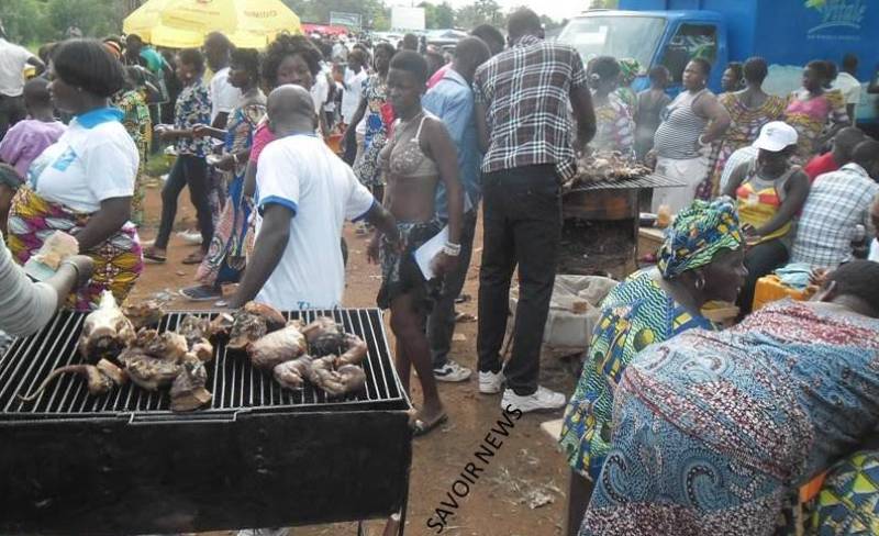 De l’autre coté, on trouve des étalages de barbecue de viandes de porcs, communément appelée +afanado+, une viande très consommée au moment des Evalas. Un peu plus loin, à quelques dizaines de mètres de là, c’est le coin des nourritures comme les beignets, les gâteaux, du sandwich, du Ayimolou (riz aux haricots), etc.