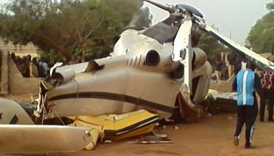 L’hélicoptère est réduit en lambeaux, selon les images diffusées par la télévision nationale.