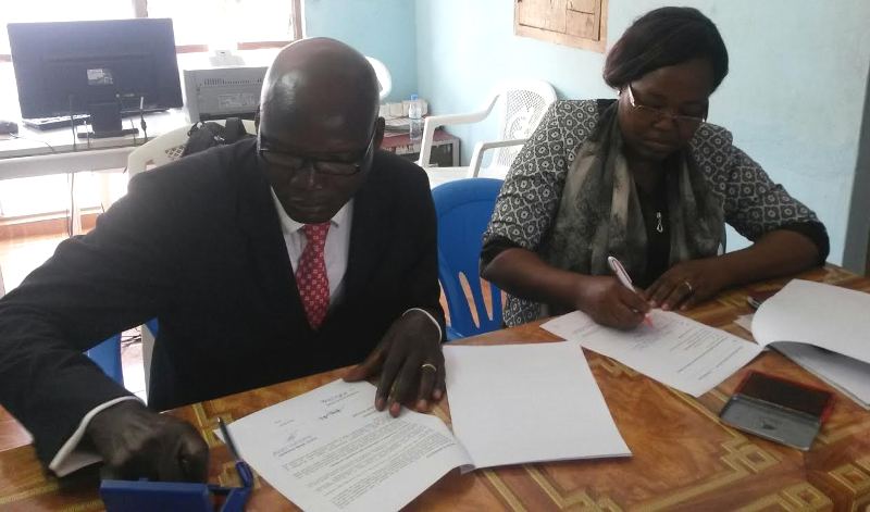 En Photo: Mme Ambroisine MEMEDE (à droite/Directrice de l’Agence Savoir News), signant le document.