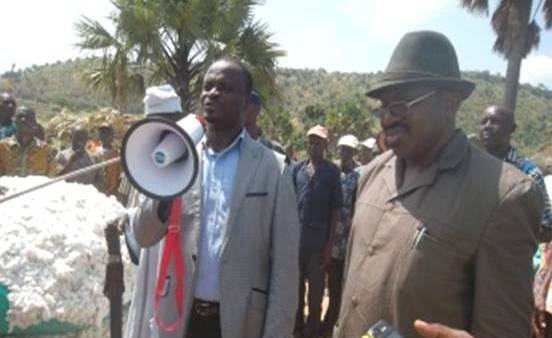 En Photo: Le préfet de Tandjouaré au mégaphone lançant la campagne d’achat avec à son coté le patron de la NSCT.