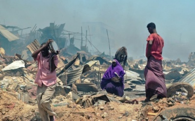En Photo: Des personnes marchent au milieu des débris après cet incendie qui a détruit lundi une grande partie du marché de Bakara, principal marché de Mogadiscio.