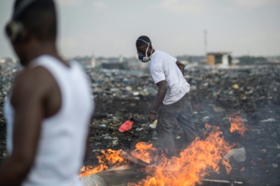 Les « Salvagers » font brûler des câbles ou des déchets électroniques dans des brasiers suffocants pour en récupérer le cuivre et d’autres matériaux. A quelques pas de là, des gamins se promènent au milieu des fumées.