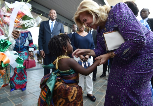 Photo: La Première dame de Côte d’Ivoire, Dominique Ouattara accueillie par une petite fille lors de l’inauguration de l’hôpital « Mère-Enfant », le 16 mars 2018 à Bingerville, un quartier d’Abidjan.