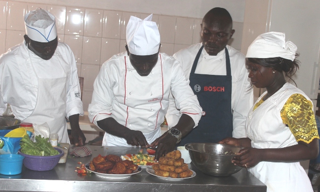 « Les produits locaux peuvent donc servir de matières premières, et nous permettre de servir des plats à la togolaise, grâce à notre sens de la créativité. Il faut faire des recherches et innover », a-t-il indiqué, surveillant son équipe activement occupé pour la confection du plat du jour : salade de gésiers (en entrée) + Sauce mouton accompagné d’igname pilé.