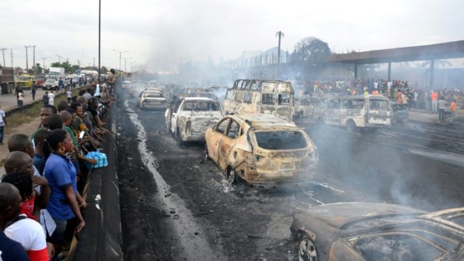 L’explosion s’est produite sur une voie rapide sur le pont Otedola en pleine heure de pointe en début de soirée, incendiant plusieurs dizaines de voitures qui avançaient pare-choc contre pare-choc.