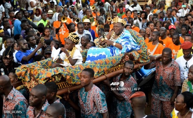 Au son des tambours, le roi Amon Tanoé de Grand-Bassam entre dans la salle de réception de son palais remplie de monde et s’assoit sur son spectaculaire trône sculpté dans une mâchoire de baleine. A l’extérieur, la police veille.
