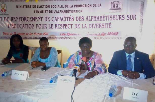 A l’occasion, la ministre de l’Action sociale, de la promotion de la Femme et de l’Alphabétisation, Mme Léa Tchabinandi Kolani-Yentcharé a relevé l’intérêt de cette activité, qui permettra de mieux répondre aux attentes grandissantes des populations analphabètes, qui en fait, n’aspirent qu’à une alphabétisation de qualité. Elle a exprimé sa gratitude au gouvernement et à l’UNESCO et rappelé que l’éducation pour le respect de la diversité est un thème central de l’éducation à la citoyenneté mondiale, thème que les pays se sont engagés à promouvoir et à mettre en œuvre.