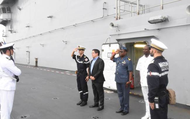 Cet imposant bâtiment a reçu l’ambassadeur de France, M. Marc VIZY, qui, après s’être rendu sur le PHA Mistral en hélicoptère Alouette 3, a été accueilli par un piquet d’honneur, avec le chef d’état-major de l’armée de l’air togolaise et le représentant du chef d’état-major de la marine togolaises. Un déjeuner y a été organisé, à l’invitation du capitaine de vaisseau Vincent SEBASTIEN, commandant du bâtiment, le vendredi 8 février. Une réception a eu lieu le soir, à laquelle étaient invités des représentants de la communauté française au Togo ainsi que des autorités civiles et militaires togolaises.