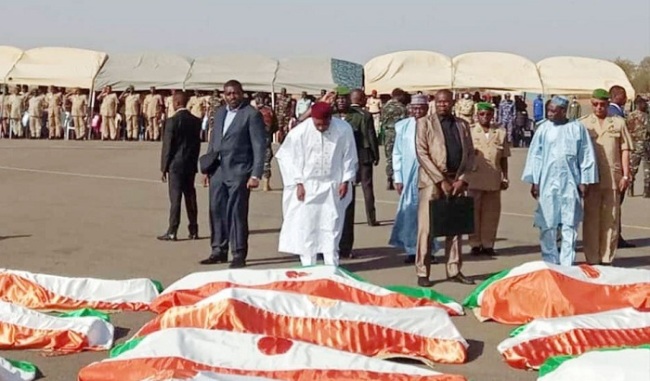 « J’ai décidé de venir pour témoigner de la reconnaissance de la patrie inconsolable mais nullement vaincue à ces hommes […], nos héros, nos martyrs», a déclaré le président Mahamadou Issoufou sur le tarmac de la base aérienne 101 de Niamey, devant les sacs mortuaires recouverts du drapeau du Niger, en présence des familles des victimes.