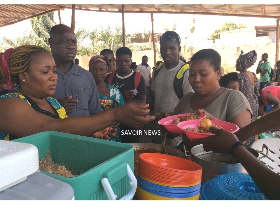 En file indienne, les bénéficiaires munis de leur carte, étaient servis, chacun selon le menu de son choix. Le coût unitaire de chaque repas est de 300 FCFA par personne vulnérable notamment les personnes malades, handicapées, veuves, orphelins, les alcooliques et drogués.