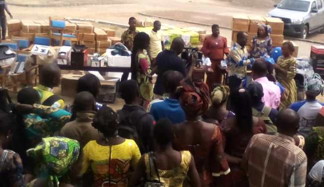 Ces kits sont composés des lave-têtes, chaises pour coiffeuses, séchoirs sur pied, machines à coudre, meules, machine à broderie, perceuses etc.
