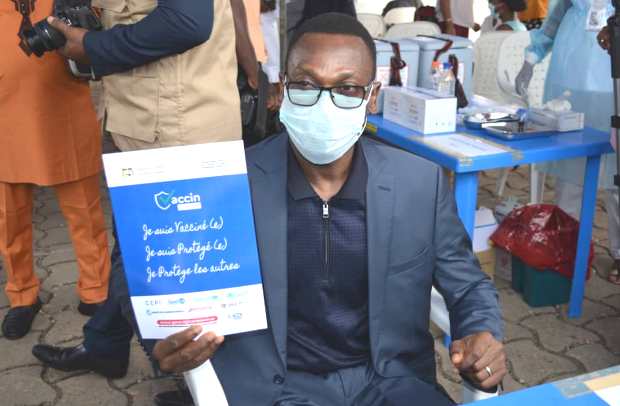 Benjamin Hounkpatin (ministre de la santé) est la première personne à recevoir sa première dose de vaccin AstraZeneca.