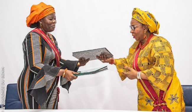 Mme Koubourath Osséni Anjorin (Grande Chancelière de l’Ordre National du Bénin sortante) a exprimé sa joie de passer la main à « une sœur ».
