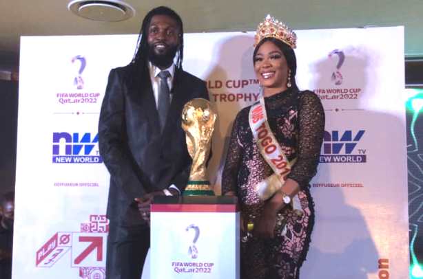 Emmanuel Adébayor et Miss Togo 2019, lors de la présentation du trophée de la Coupe du monde