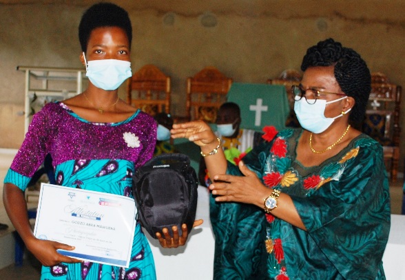 Une bénéficiaire, recevant son attestation et une prix spécial