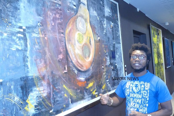 Devant l’un de ses tableaux exposés à l’hôtel Onomo, Daté Kodjo Amouzou (artiste plasticien) nous donne des explications : « Ce tableau-ci, je l’ai appelé Rideau de voile. On y voit des objets en filigrane et la couleur dominante est le rouge qui, pour moi, signifie endurance, courage, énergie. Le tableau en face, c’est +Infiniment+, un portail ouvert sur l’univers. Celui qui est à gauche, c’est Genesis (ou la création) ».