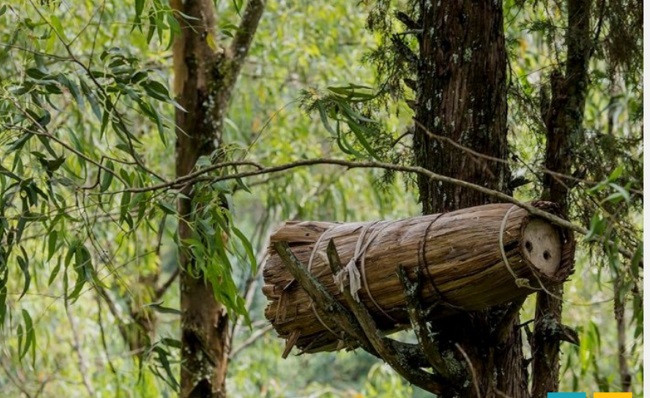 Les ruches prêtes à être habitées sont installées dans les arbres avec un système de cordage, ou sur un toit .