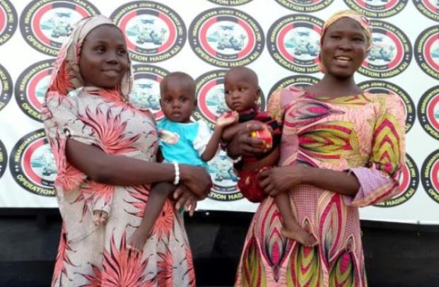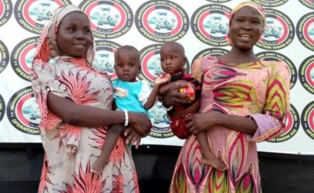 Les deux jeunes femmes faisaient partie des 276 écolières âgées de 12 à 17 ans enlevées de leur pensionnat de Chibok, dans le nord-est du Nigeria. Leurs bébés dans les bras, elles ont été présentées à la presse par l’armée.