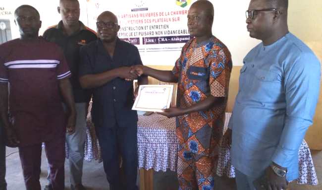 Cette formation a été organisée par la chambre régional de métiers des Plateaux (CRM) avec l’appui financier du Fonds National d’Apprentissage, de Formation et de Perfectionnement Professionnels (FNAFPP) dans le cadre de la promotion des WC non vidangeables pour la protection de l’environnement.