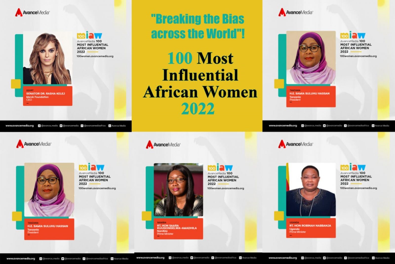 Le Président de la Tanzanie, S.E. SAMIA SULUHU HASSAN ; CEO de la Fondation Merck, Sénatrice, Dr. Rasha Kelej ; La Première Ministre de l’Ouganda, Rt. Hon Robinah Nabbanja ; La Première Ministre de la Namibie, Rt. Hon Saara Kuugongelwa-Amadhila ; et Victoire Tomegah Dogbé (Premier ministre du Togo) parmi les 100 Femmes Africaines les Plus Influentes en 2022.