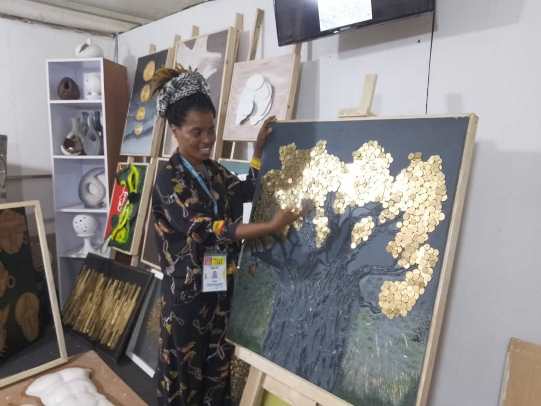 « Le tableau peint avec ces pièces de monnaies avec en forme de raisin, je l’ai nommé la saveur et celui en forme de feuilles de baobab, la récolte », a-t-elle ajouté.