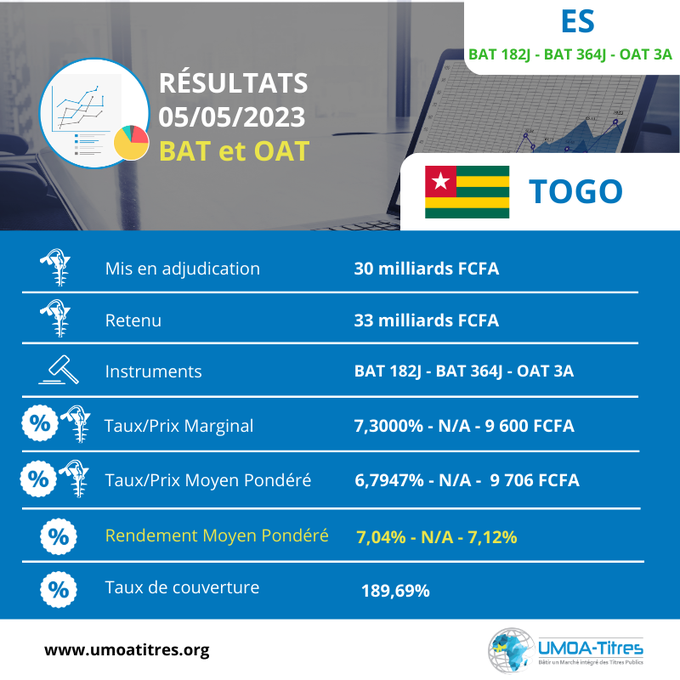 Le pays était à la recherche de 30 milliards de F.CFA. Avec un taux de couverture de 189,69%, l’opération, une émission simultanée de Bons et d’Obligations Assimilables du Trésor (BAT et OAT), a permis de rassembler 24 milliards F.CFA via les BAT de 182 jours et 2 milliards F.CFA via celles de 364 jours. Pour les OAT de 3 ans, 7 milliards F.CFA ont été mobilisés.