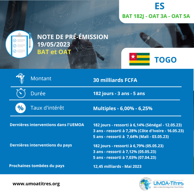 L’opération qui sera bouclée le vendredi 19 mai 2023 est une émission simultanée de Bons et d’Obligations Assimilables du Trésor (BAT et OAT).