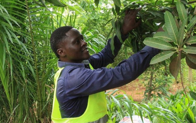 Sébastien BALOUKI, arrosant des plants dans le centre agro-écologique de l’ONG à Lomé