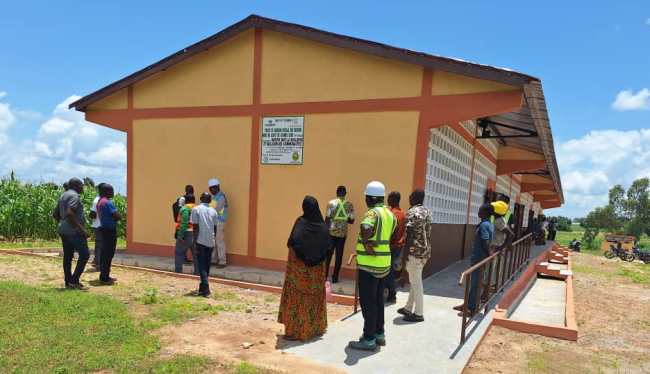 Le village de Kpalmatongue Centre a bénéficié d’un bâtiment scolaire de quatre salles de classes avec un bureau, un magasin, de deux blocs de latrines à trois cabines chacun et un forage photovoltaïque. Les deux bâtiments seront équipés en mobiliers (tables-bancs).