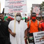 Habillés en noir et rouge, les manifestants brandissaient des pancartes dénonçant la gestion du gouvernement du Ghana, pays ouest-africain anglophone qui traverse l’une de ses pires crises économiques depuis des années.