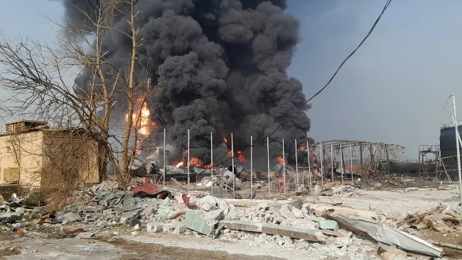 Des soldats massivement déployés, casqués et masqués empêchent la circulation dans le secteur du sinistre. La zone portuaire est désertée depuis la veille où les populations locales ont fui vers la banlieue.
