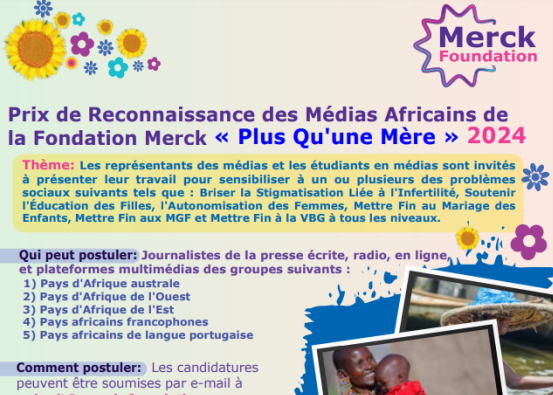 La Fondation Merck lance un appel à candidature pour récompenser les journalistes qui apportent une contribution substantielle à la lutte contre les violences basées sur le genre, le mariage des enfants, la stigmatisation liée à l’infertilité, les mutilations génitales féminines, ainsi que ceux qui soutiennent l’éducation des filles et l’autonomisation des femmes.