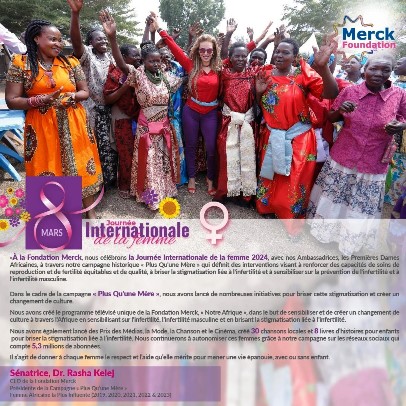 La Fondation Merck célèbre la Journée Internationale de la Femme 2024 à travers son programme « Plus Qu’une Mère » lancé en 2016 pour autonomiser les femmes vivant avec l’infertilité grâce à l’accès à l’information, à la santé et au changement de mentalité. Cette célébration bénéficie de la collaboration avec les Premières Dames Africaines (ambassadrices de la Fondation Merck Plus qu’une mère).