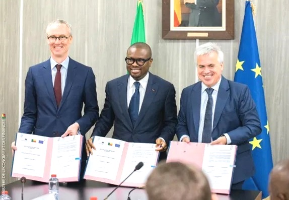 Romuald Wadagni, ministre d’Etat, de l’Economie et des Finances et Koen Doens, directeur général des Partenariats internationaux au sein de la Commission européenne ainsi que Roger Stuart, chef du pôle régional Afrique de l’Ouest et centrale de la Banque européenne d’investissement (Bei), ont annoncé la mobilisation d’un montant d’environ 109 milliards francs CFA au profit du Bénin.
