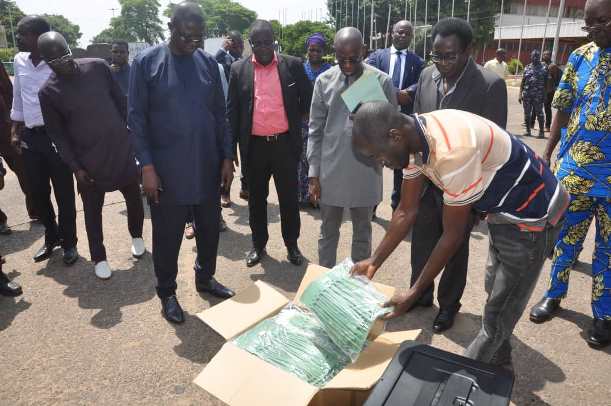 Le convoiement dudit matériel (urnes, isoloirs, encre indélébile, bulletins de vote, lampes tempêtes entre autres) s’est déroulé en présence de Dago Yabré (président de la CENI), des membres de ladite institution, et du Colonel Awaté Hodabalo (ministre de l’Administration territoriale, de la décentralisation et des collectivités locales).