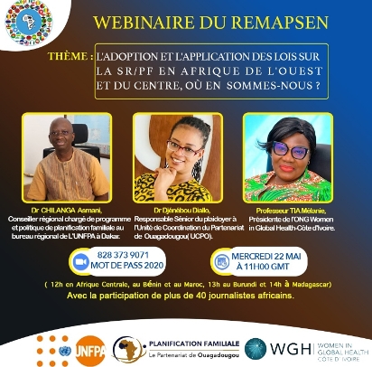 Une centaine de journalistes membres du Réseau des médias pour la promotion de la santé et de l’environnement (REMAPSEN) se sont retrouvés dans le cadre de leur traditionnelle réunion en ligne pour en savoir plus sur l’application des lois sur la santé sexuelle et reproductive, ainsi que la planification familiale (SR/PF) en Afrique de l’Ouest et du centre.